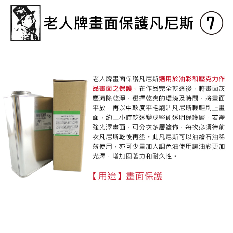 ●老人牌畫面保護凡尼斯適用於油彩和壓克力作品畫面之保護。