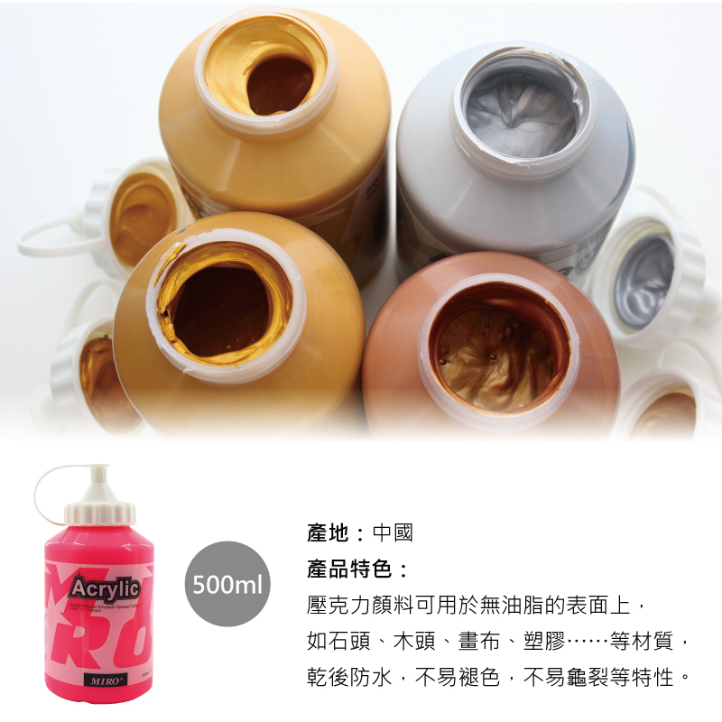 ●壓克力顏料可用於無油脂的表面上,如石頭、木頭、畫布、塑膠⋯⋯等材質,乾後防水,不易褪色,不易龜裂等特性。