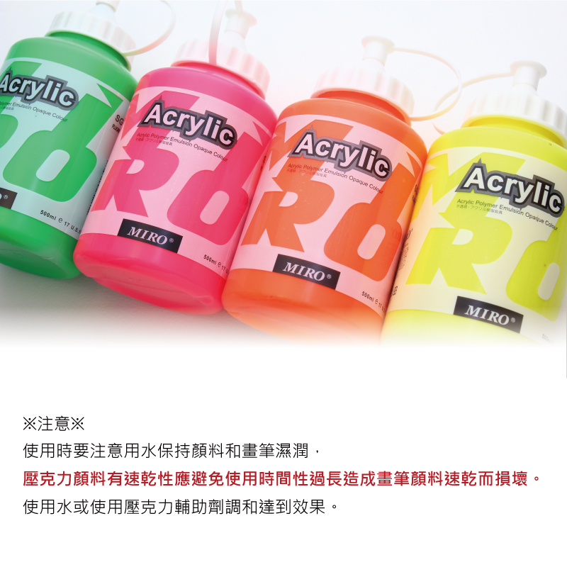 ●使用時要注意用水保持顏料和畫筆濕潤,壓克力顏料有速乾性應避免使用時間性過長造成畫筆顏料速乾而損壞。
