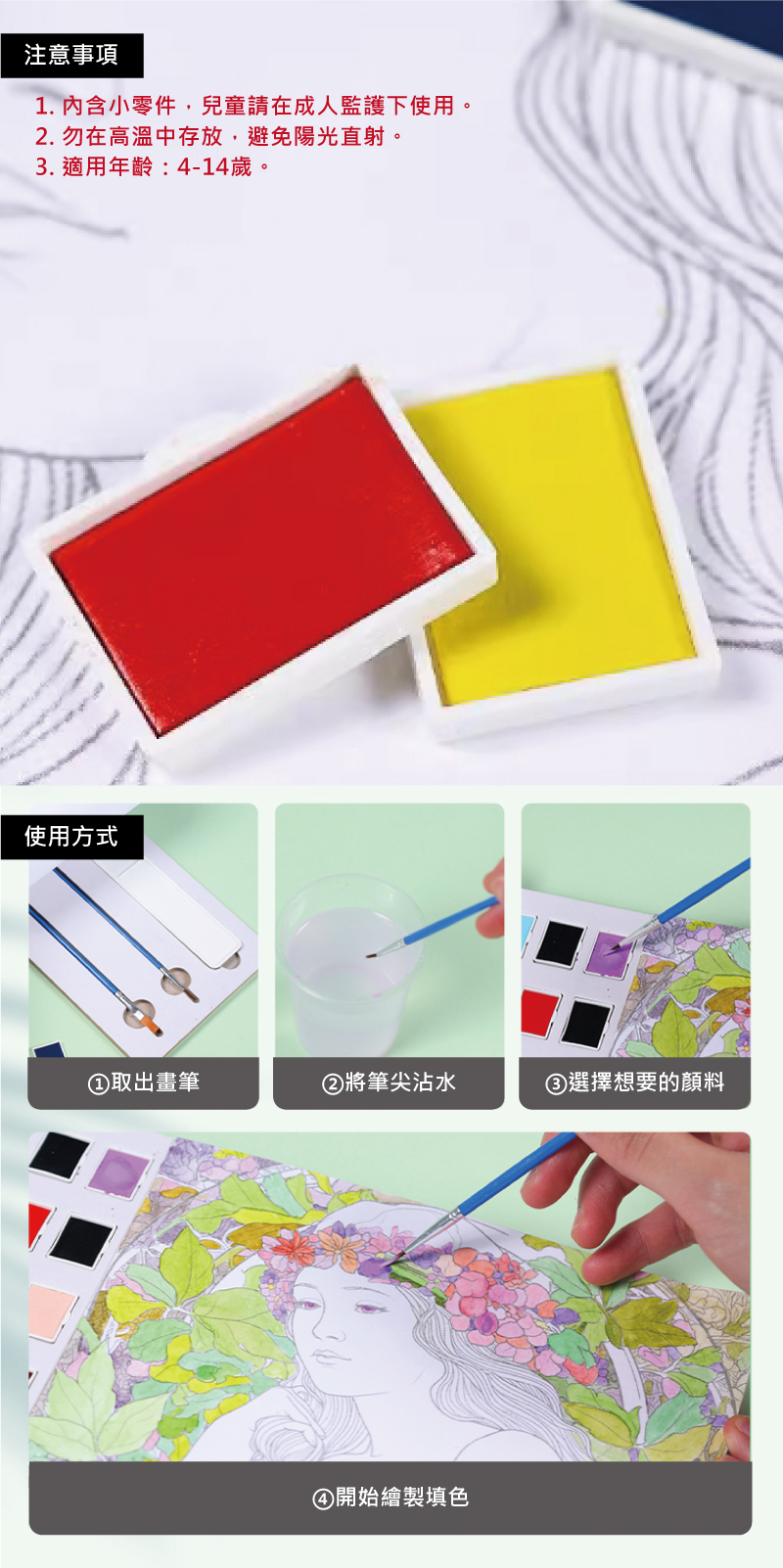 ●12色套組皆附畫筆*2支、顏料*12色、調色板*1個、填色卡*20張。