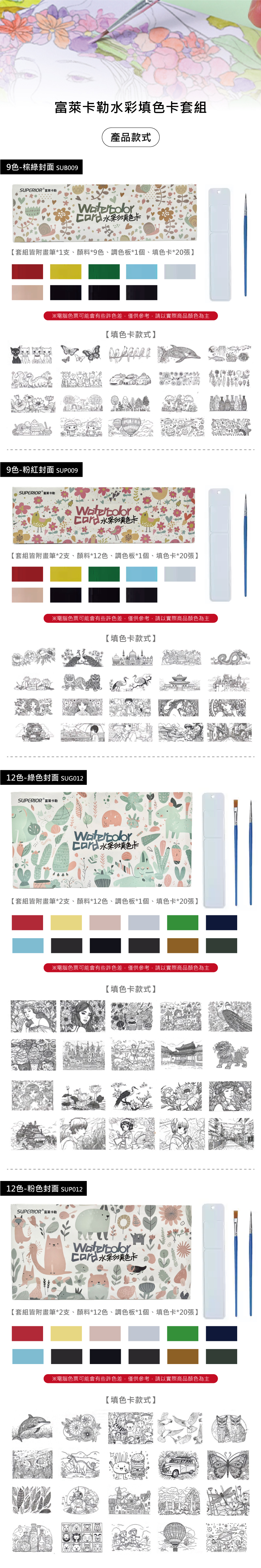 ●9色套組皆附畫筆*1支、顏料*9色、調色板*1個、填色卡*20張。