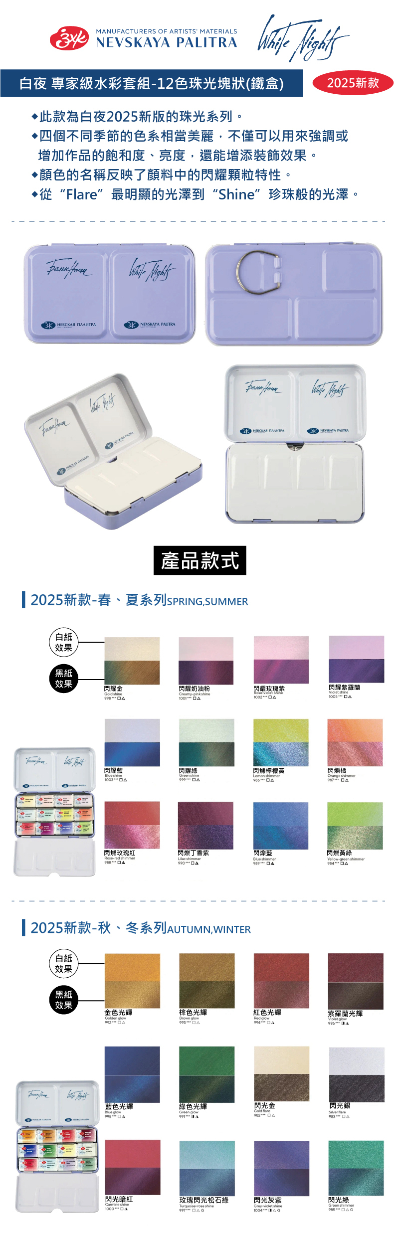 ●顏色的名稱反映了顏料中的閃耀顆粒特性。
