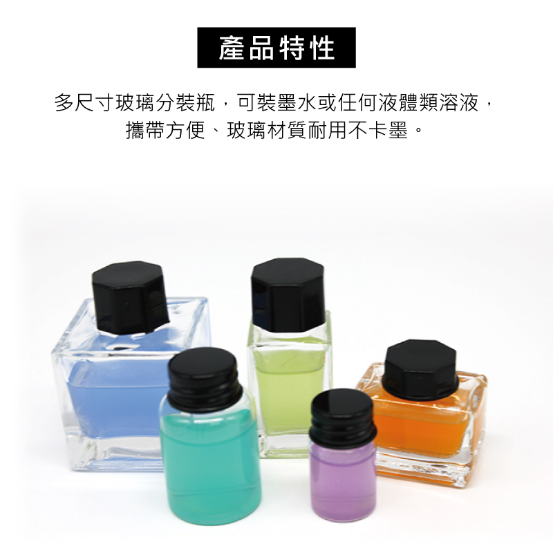 ●多種尺寸的玻璃分裝瓶,可裝墨水或任何液體類溶液,攜帶方便,玻璃材質耐用不卡墨。