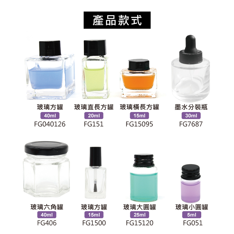 規格:方罐 / 直長方罐 / 橫長方罐 / 玻璃六角罐 / 玻璃方罐 / 玻璃大圓罐 / 玻璃小圓罐 / 墨水分裝瓶