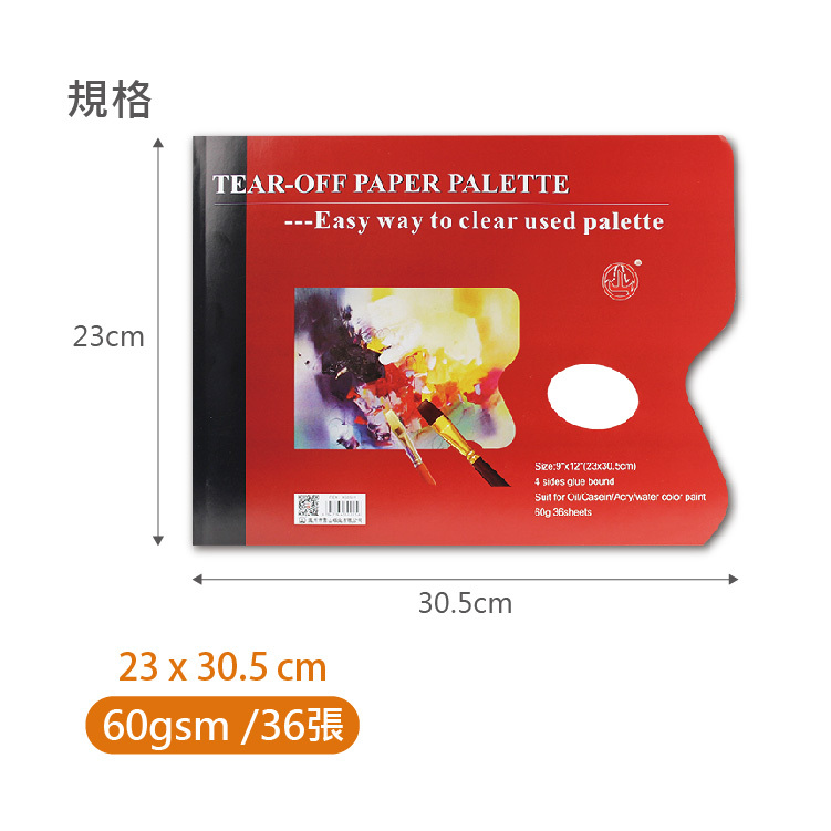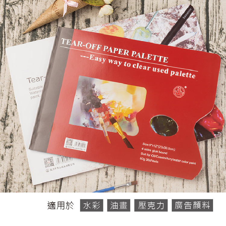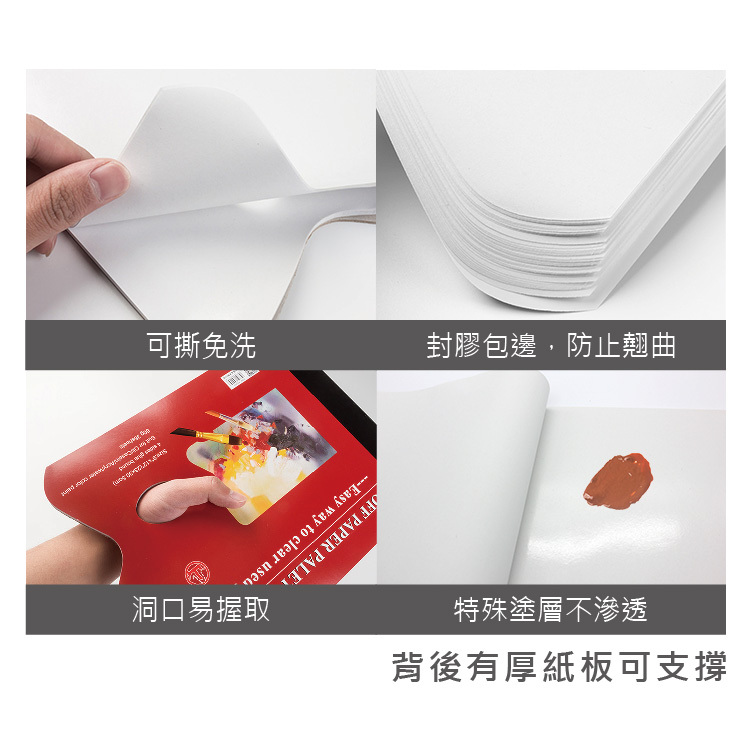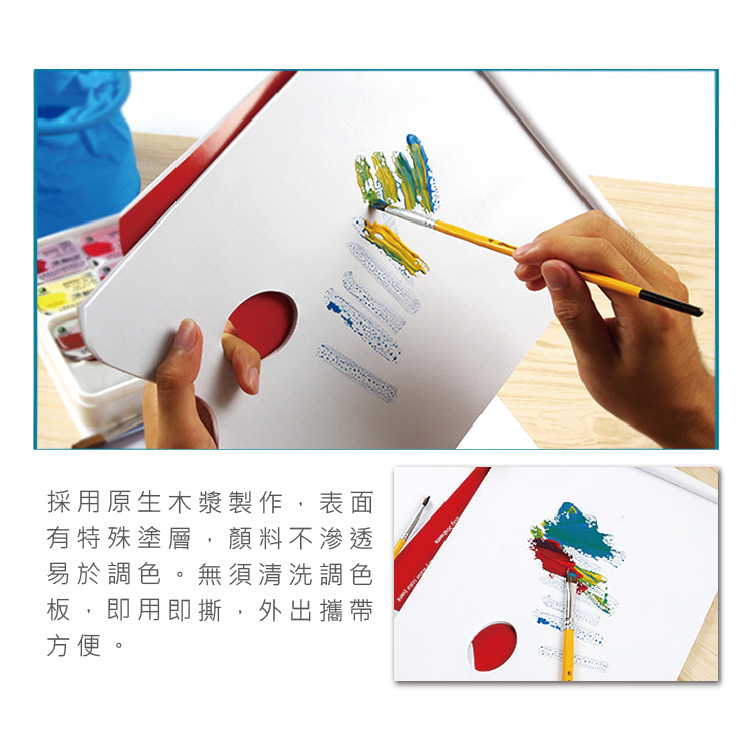 ●採用原生木漿製作,表面有特殊塗層,顏料不滲透,易於調色。