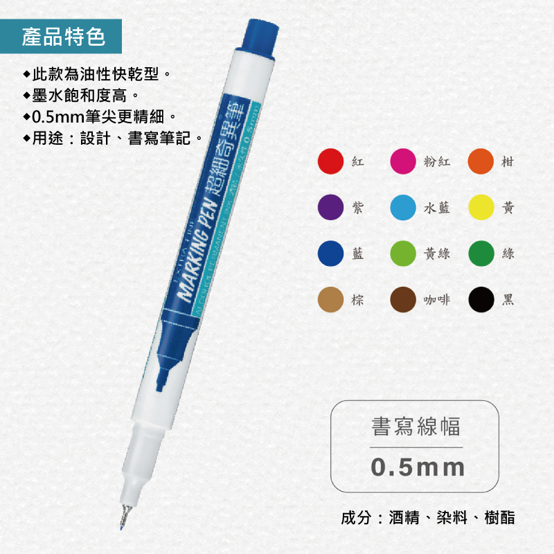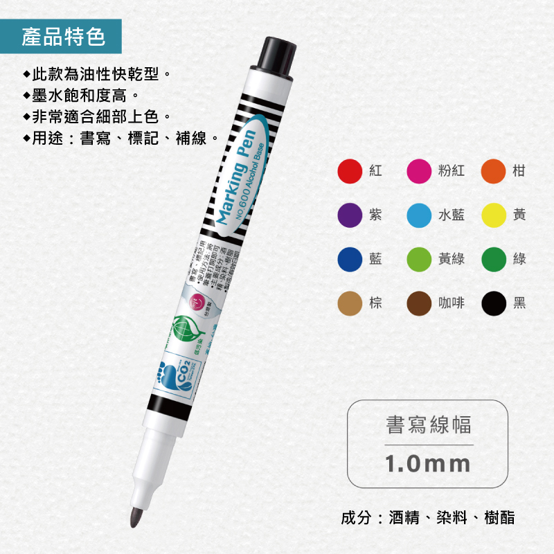 ●適用於書寫或繪畫,可畫在紙類、木材、布類、玻璃、陶瓷、塑膠或金屬等材質表面。