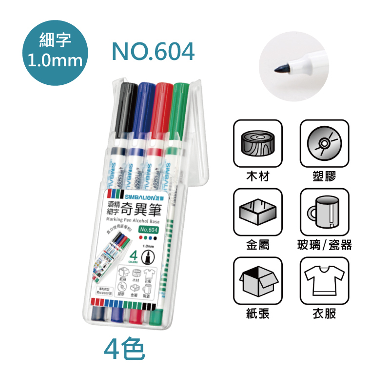 酒精細字奇異筆4色套組 NO.604 (筆尖1.0mm)