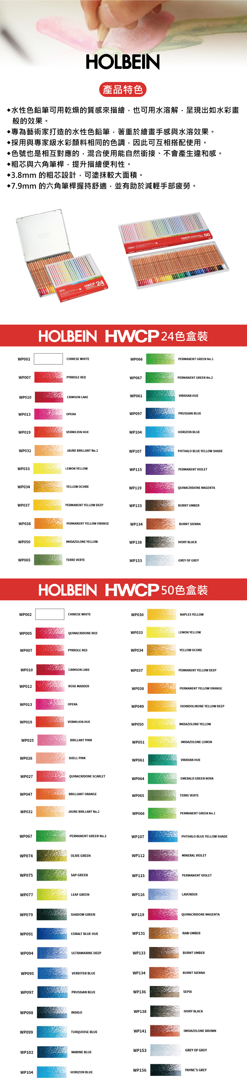 ● Holbein 好賓專家級水性色鉛筆採用與其專家級水彩相同的色調,自 1946年以來深受全球水彩畫家喜愛,以相同的色號系統,方便跨媒材整合運用。