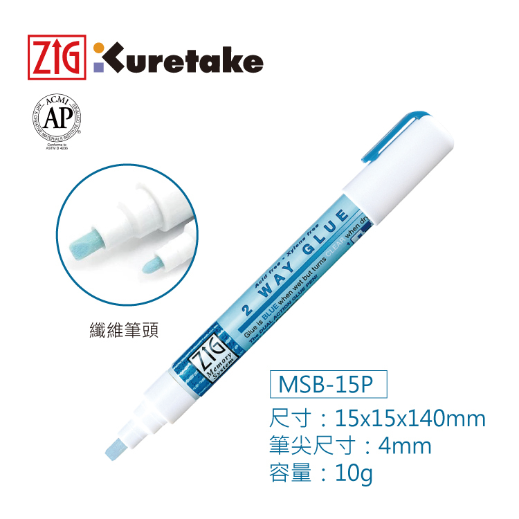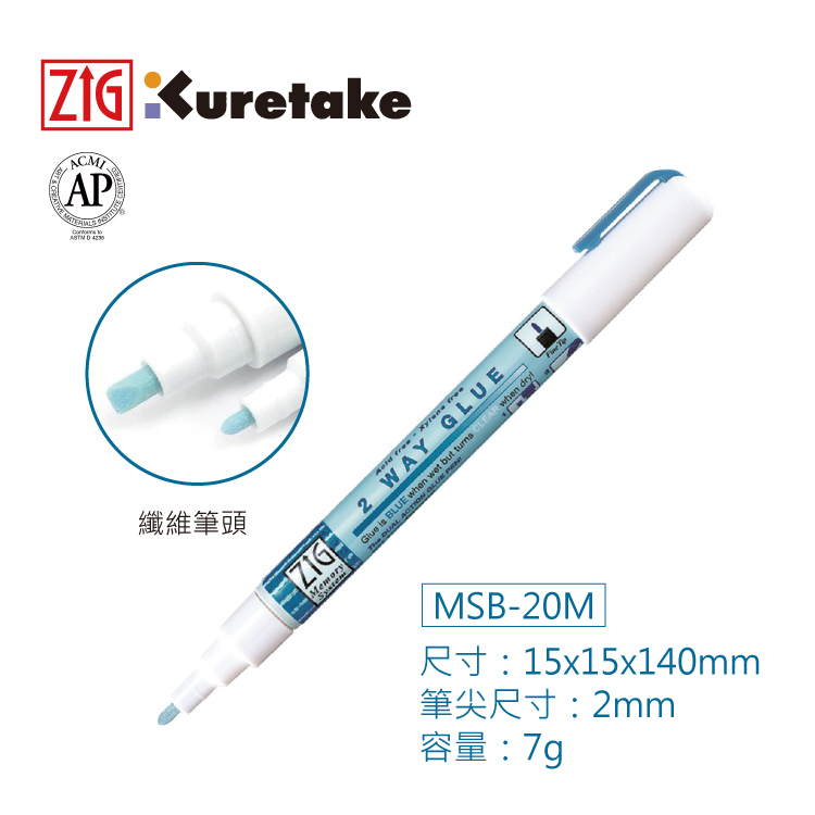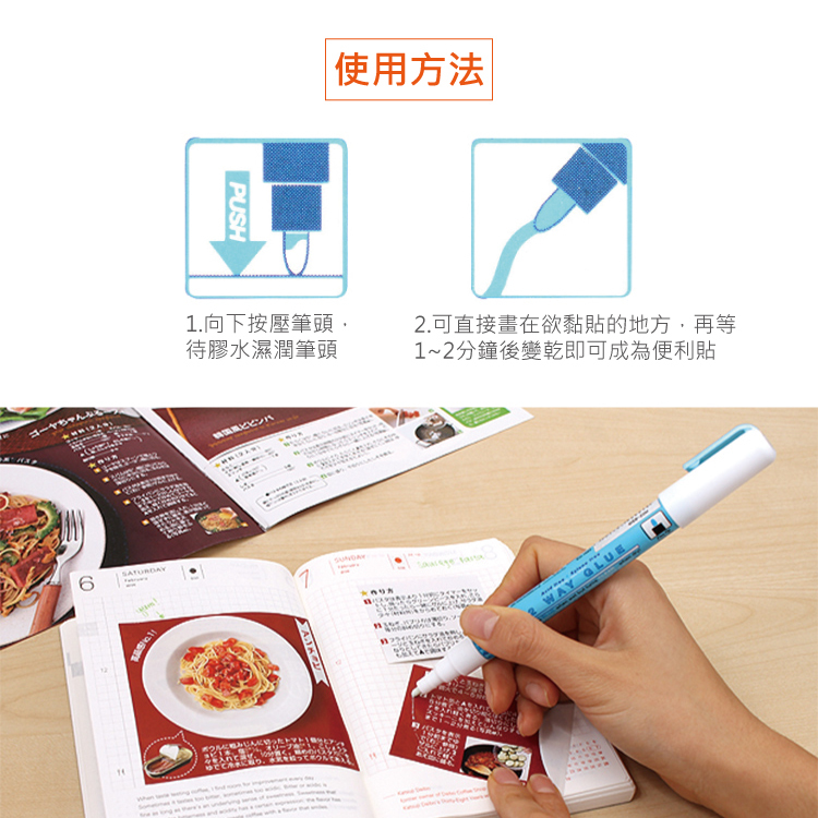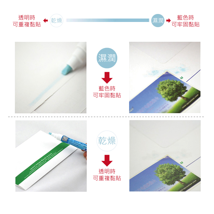 ●膠水筆濕用時是藍色可黏貼牢固,待乾後轉透明即可做為便利貼重覆貼黏使用。