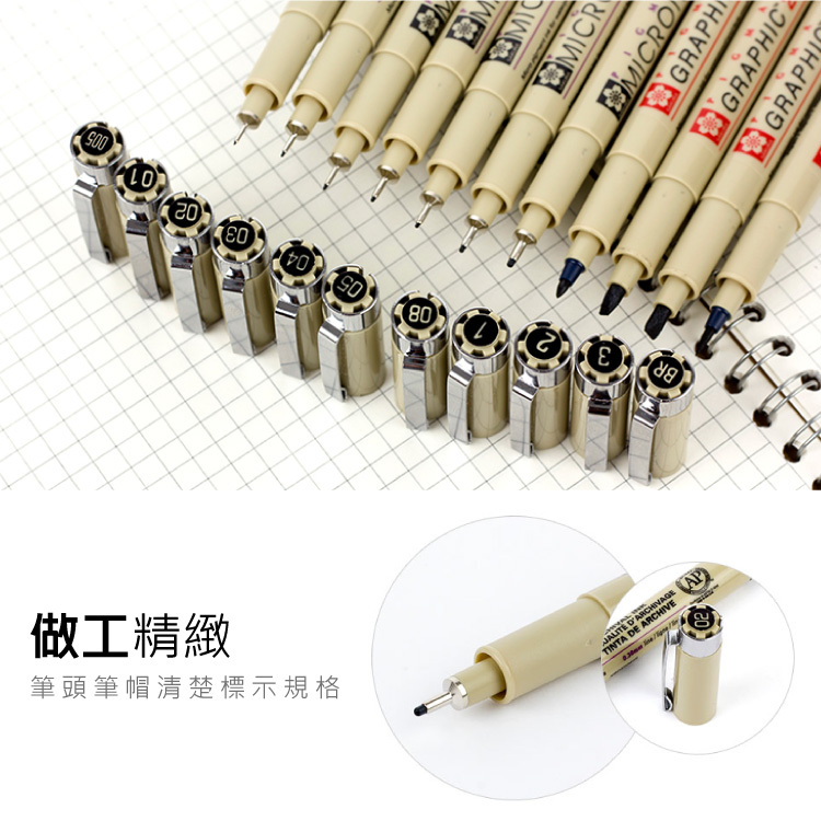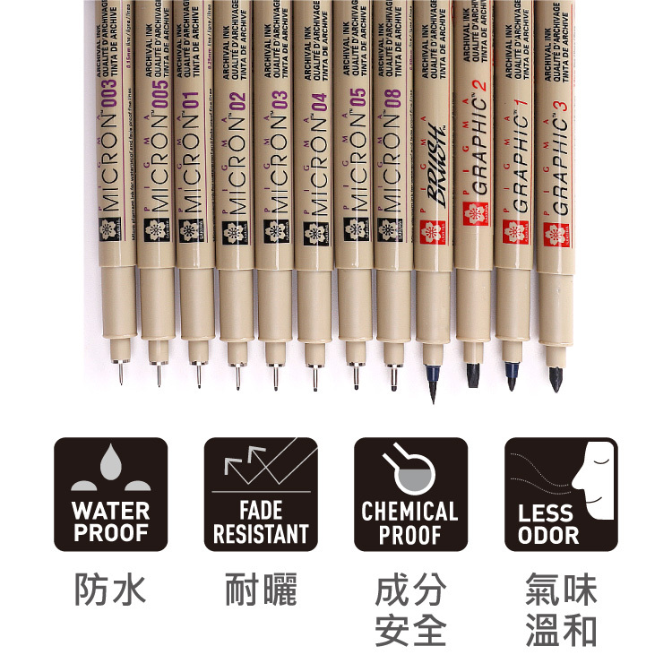 ●其耐光性和色牢性均由平面設計師和藝術家們鑑定,被命名為Pigma(筆格邁)。
