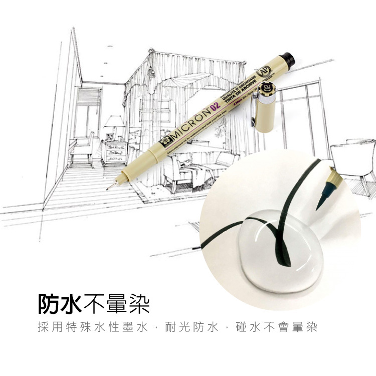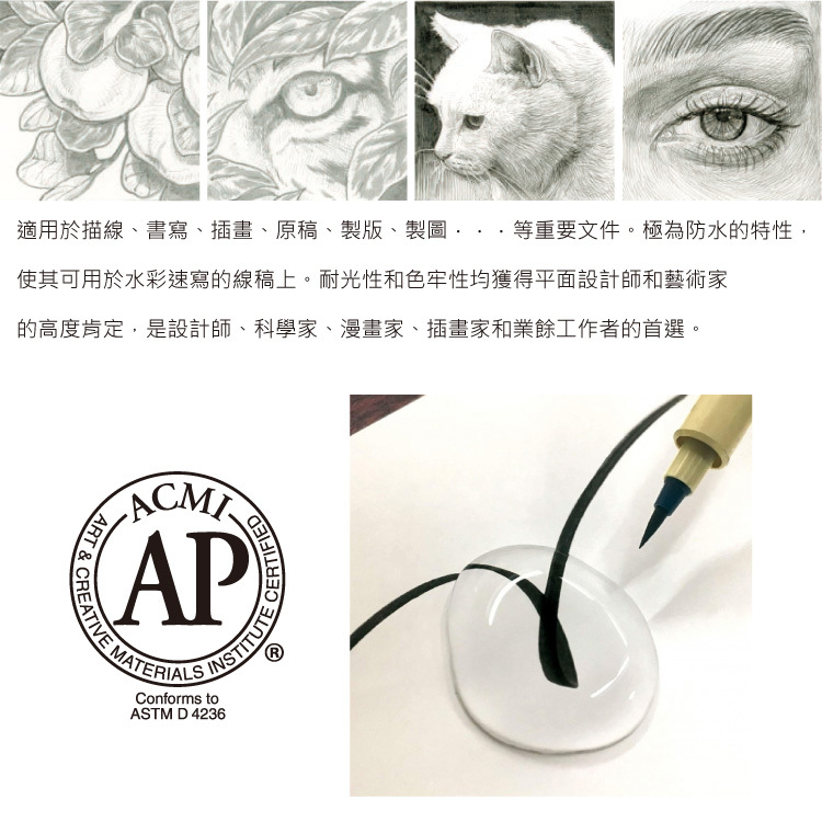 ●極佳的防水性,使其可用於水彩速寫的線稿上。耐光性和牢固性是設計師、漫畫家、插畫家和業餘工作者的首選。
