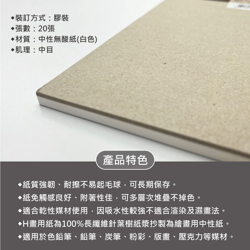 ●H畫用紙為100%長纖維針葉樹紙漿抄製為繪畫用中性紙。