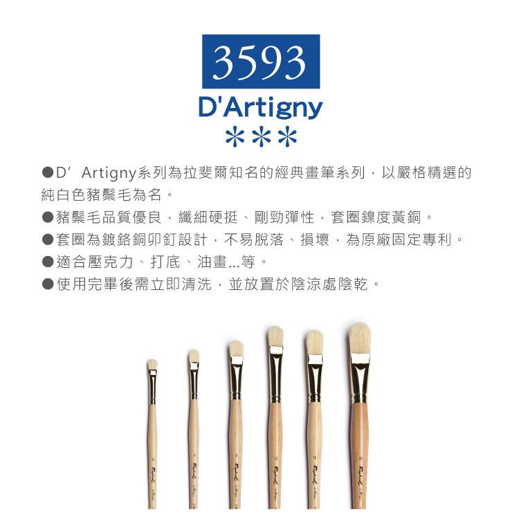 ●D’Artigny系列為拉斐爾知名的經典畫筆系列,以嚴格精選的純白色豬鬃毛為名。