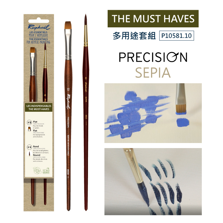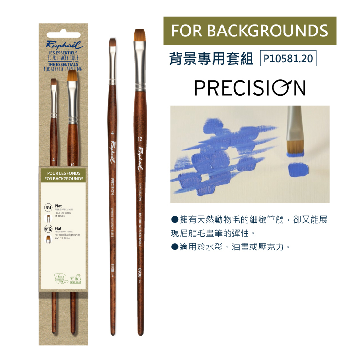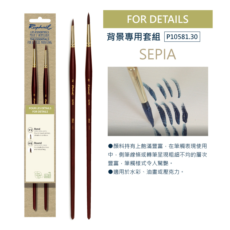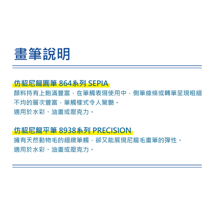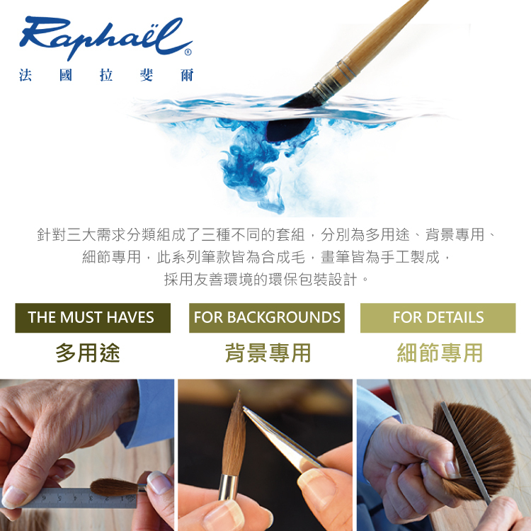 ●針對三大需求分類組成了三種不同的套組,分別為多用途、背景專用、細節專用,此系列筆款皆為合成毛,畫筆皆為手工製成,採用友善環境的環保包裝設計。