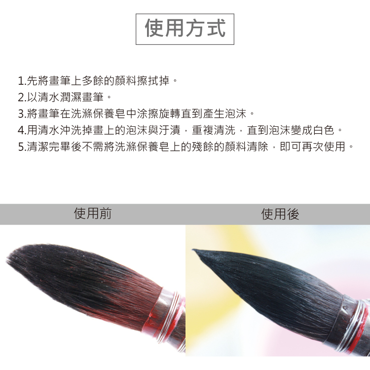 5.清潔完畢後不需將洗滌保養皂上的殘餘的顏料清除,即可再次使用。