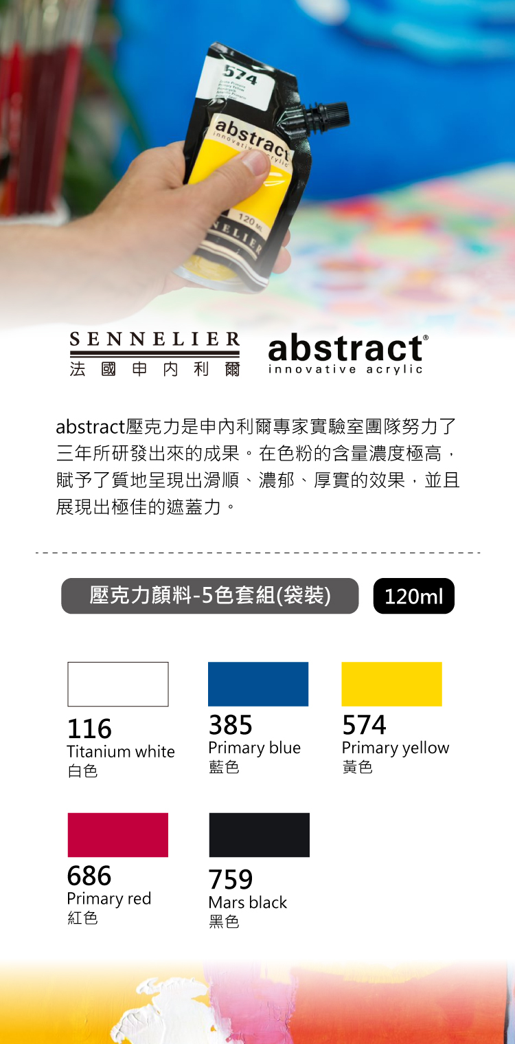 ●abstract壓克力是申內利爾專家實驗室團隊努力了三年所研發出來的成果。在色粉的含量濃度極高,賦予了質地呈現出滑順、濃郁、厚實的效果,並且展現出極佳的遮蓋力。