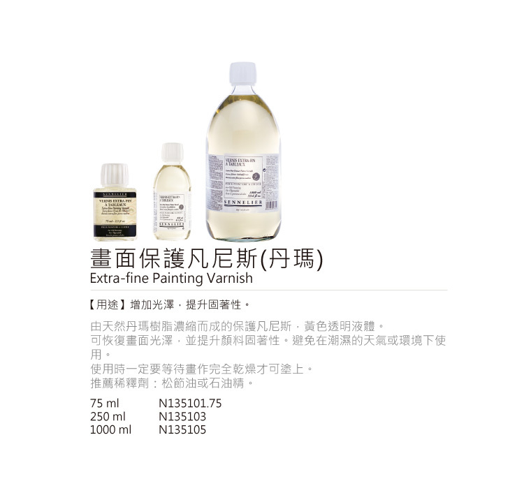 ●由天然丹瑪樹脂濃縮而成的保護凡尼斯,黃色透明液體。
