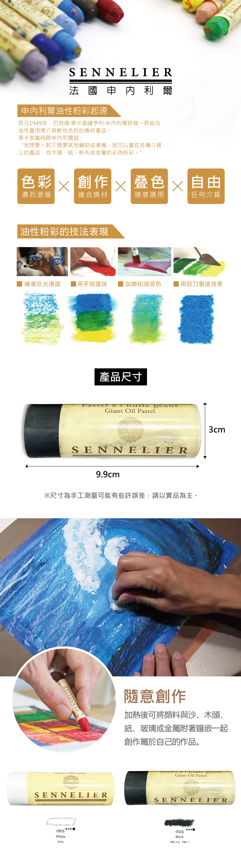 ●自由搭配複合媒材創作,可使用於光滑面、用手指塗抹、用刮刀製造效果、加調和油混色。