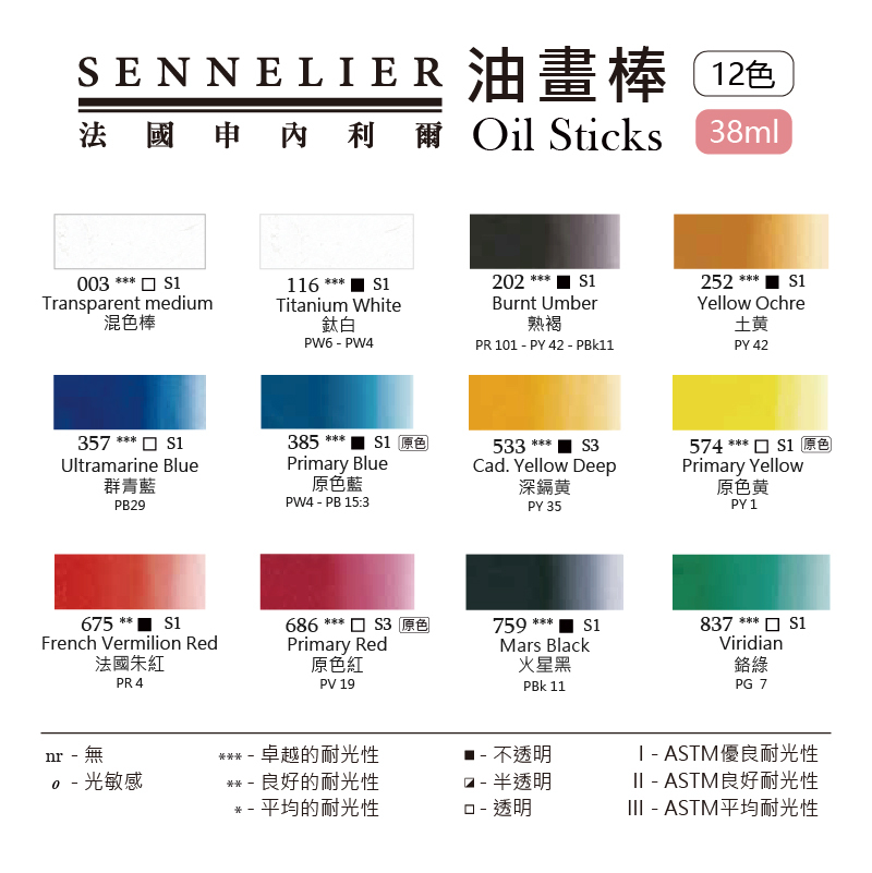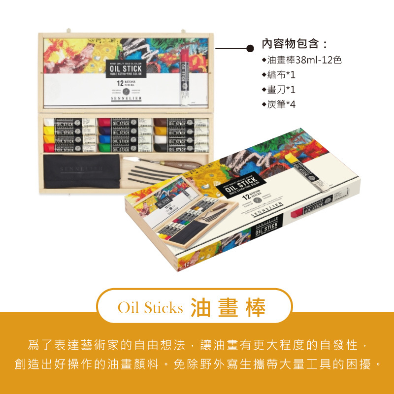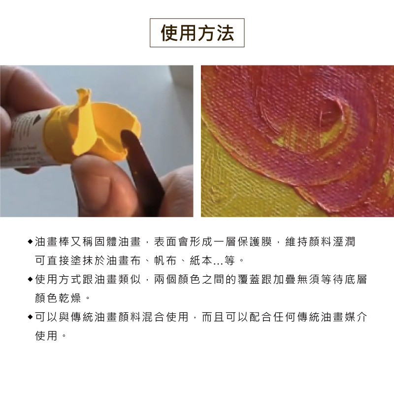 ●油畫棒又稱固體油畫,表面會形成一層保護膜,維持顏料濕潤可直接塗抹於油畫布、帆布、紙本...。