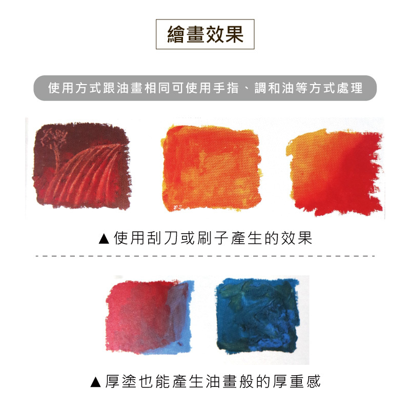 ●使用方式和油畫類似,兩個顏色之間的覆蓋和疊加無須等待底層顏色的乾燥。