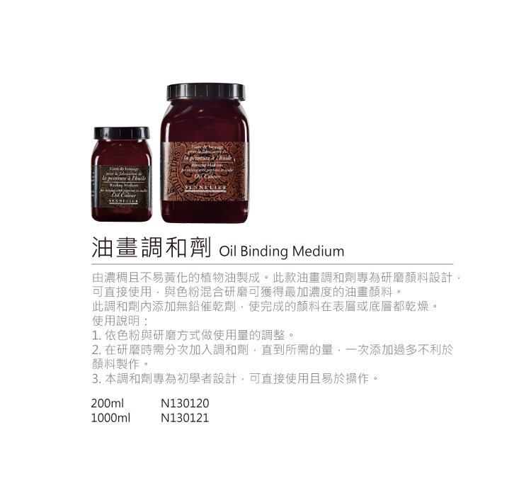 ●由濃稠且不易黃化的植物油製成。此款油畫調和劑專為研磨顏料設計,可直接使用,與色粉混合研磨可獲得最加濃度的油畫顏料。