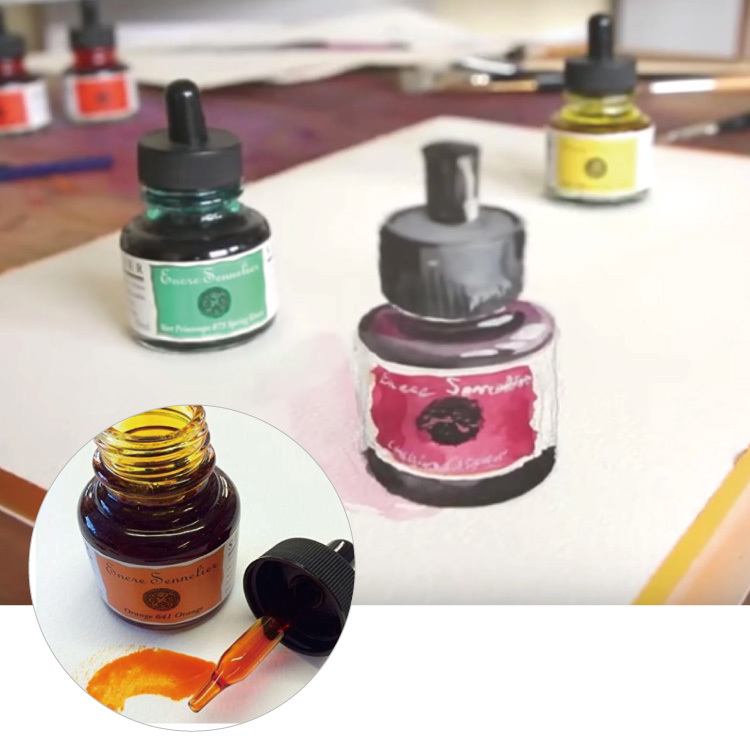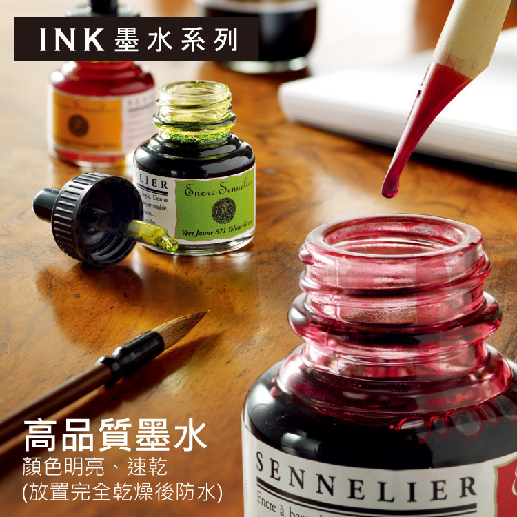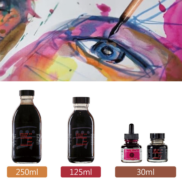 ●可以使用筆刷和沾水筆沾取,根據沾取的多寡,能呈現出從緞面到亮面等不同質感的效果,因此在書法、鵝毛等繪圖、渲染與紡織品創作等多個領域皆備受追捧與青睞。