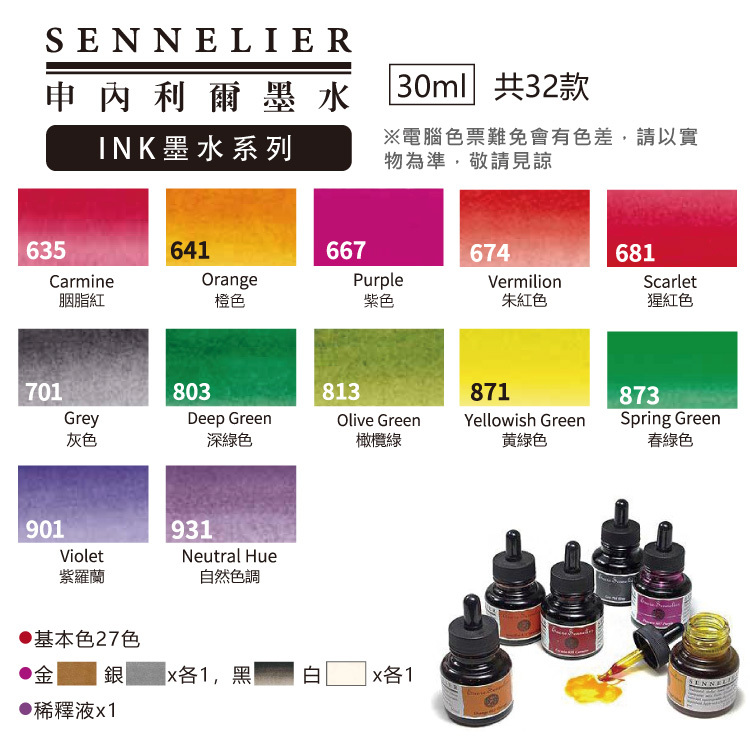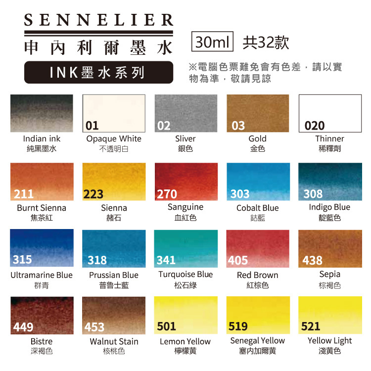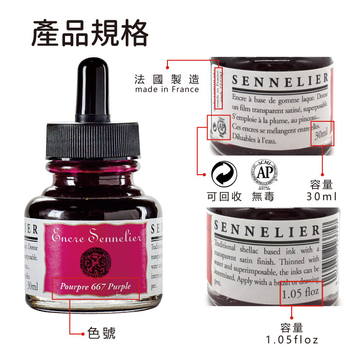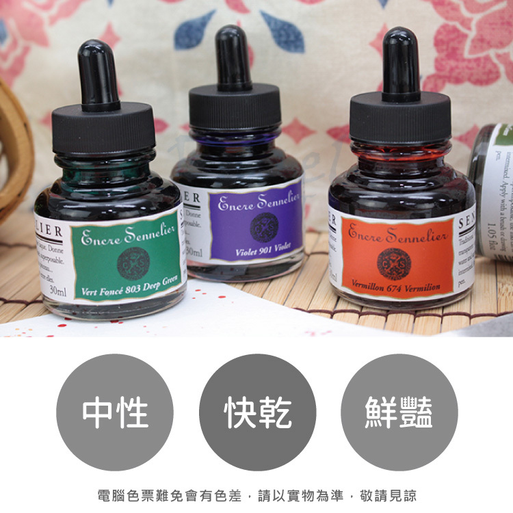 ●墨水彩用蟲膠作為黏著劑所製成。每個色調都呈現出相當濃郁的光澤,在自然光線下呈現出獨一無二的明亮度和光澤感。