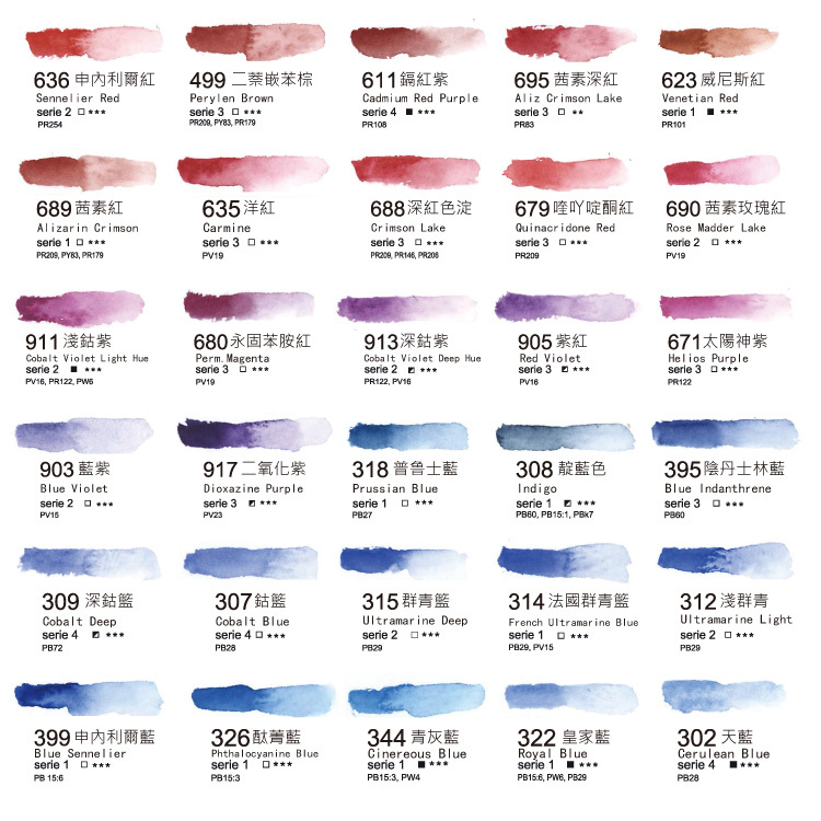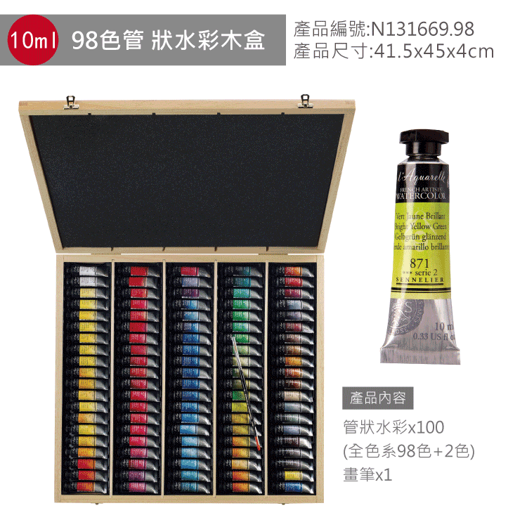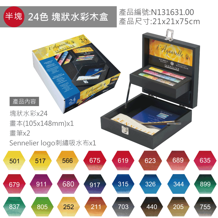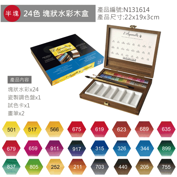 規格:24色半塊 (木盒)、12色10ml (木盒)、11色10ml (雙層黑木盒)、24色半塊 (雙層黑木盒)、98色10ml (木盒)