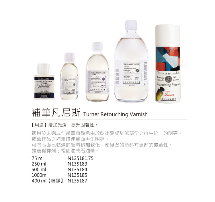 ●適用於未完成作品畫面顏色由於乾後變成灰沉部份之再生統一的明亮,或舊作品之補筆時使畫面再生明亮。