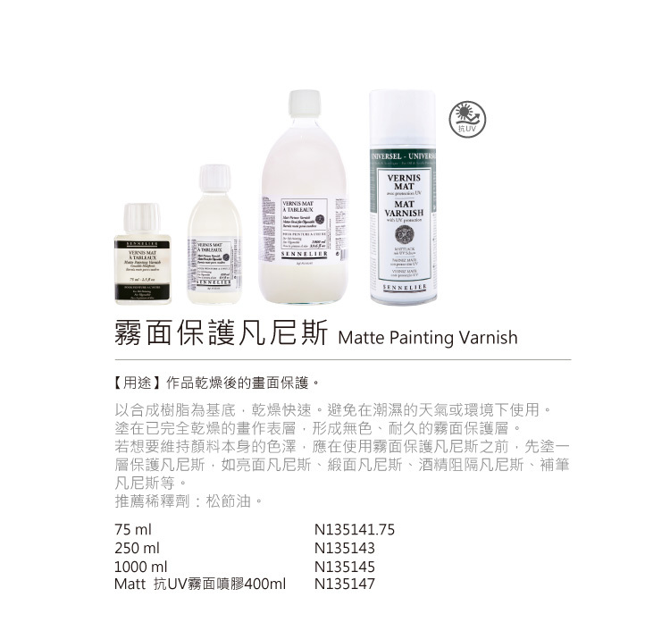 ●若想要維持顏料本身的色澤,應在使用霧面保護凡尼斯之前,先塗一層保護凡尼斯,如亮面凡尼斯、緞面凡尼斯、酒精阻隔凡尼斯、補筆凡尼斯等。