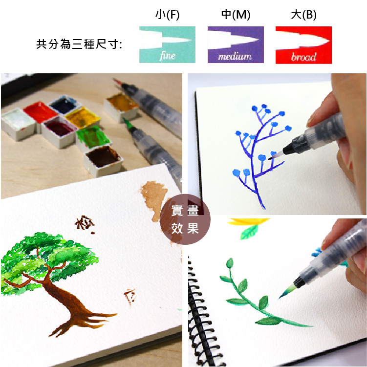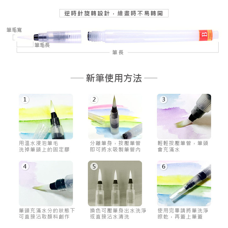 ●筆身可以裝水,輕壓握筆處即可出水,不需另外使用洗筆筒,清潔也很便利。