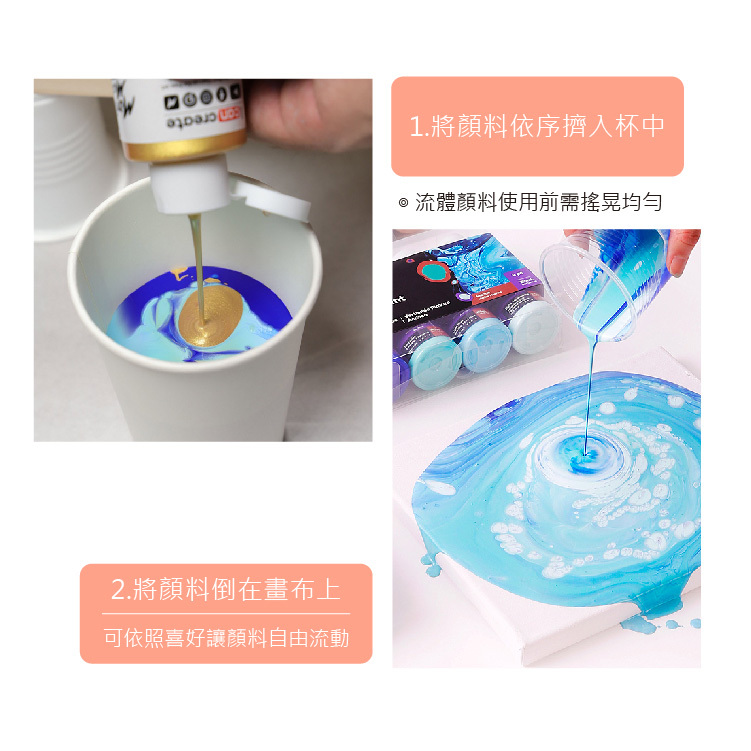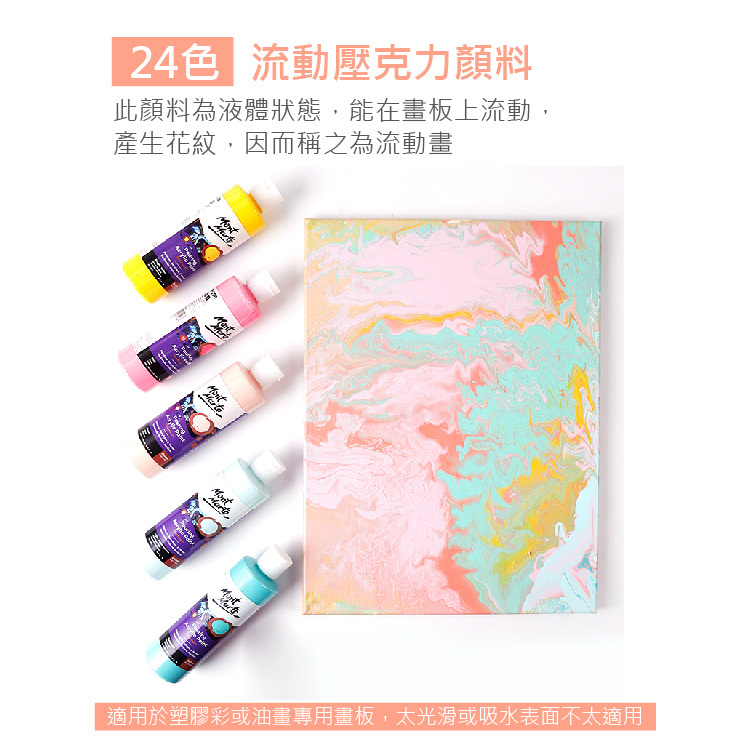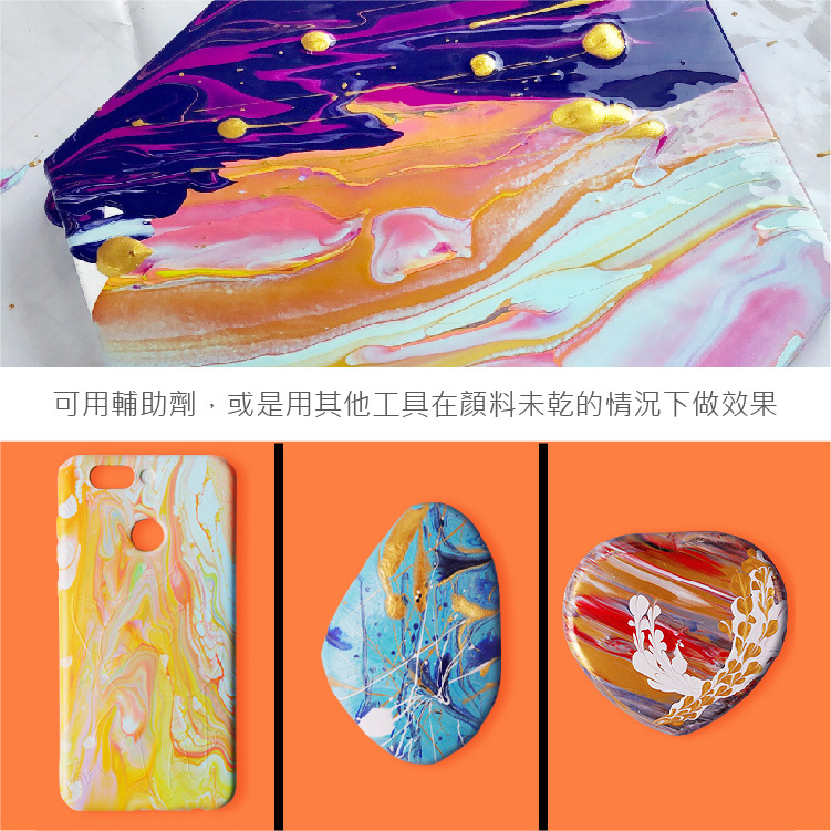 因壓克力顏料本身是稠狀,故加入輔助劑(或稱流動媒介)調和,壓克力的顏色不會被稀釋,但是卻可以呈現流動狀態,另外透過與油的作用,畫面會產生Cell(圓形線條或是小孔洞),利用這個特性去完成的畫作就稱為壓克力流動畫,是個不用透過思考,就可以讓顏料幫你做畫的過程。