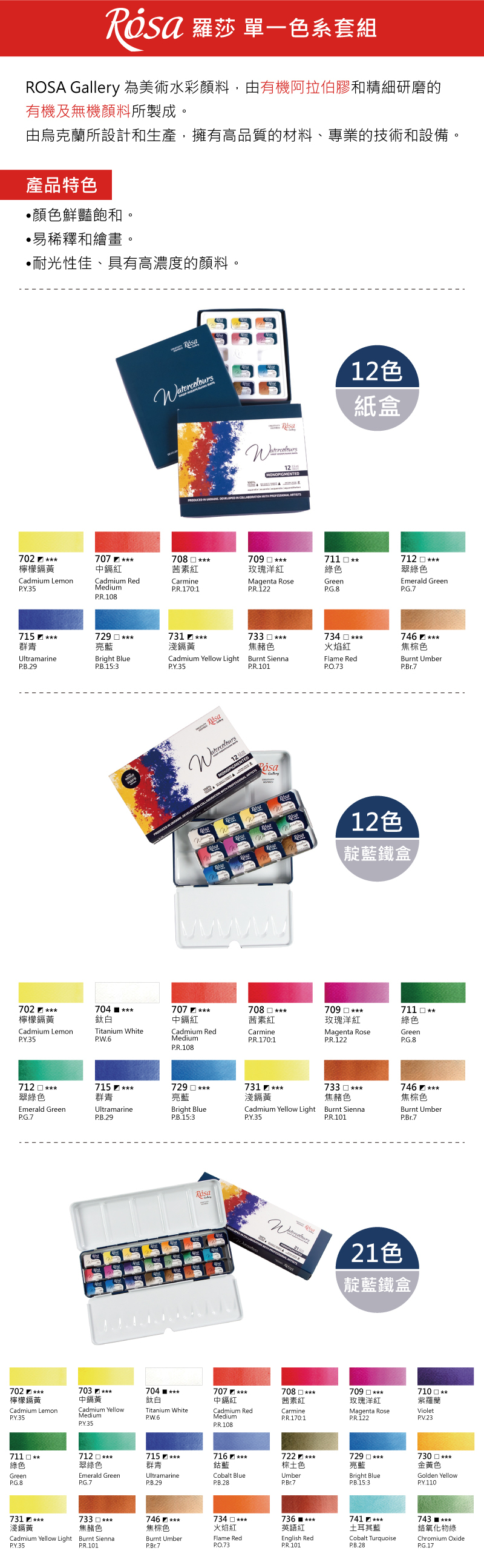 ●ROSA Gallery 為美術水彩顏料,由有機阿拉伯膠和精細研磨的有機及無機顏料所製成。